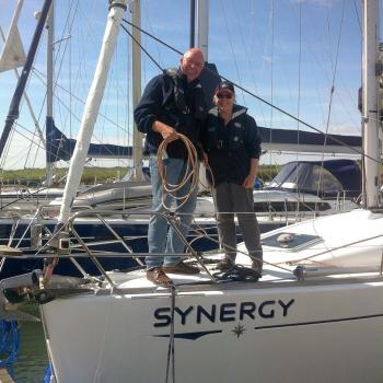 Sadly, our fun with the buoy had not ended. After dark the wind dropped and left Synergy just drifting on the end of her mooring line. During the night the buoy slipped down the side of the boat and banged against the hull waking us all up. I tried every combination: shortening the line, lengthening the line, putting a spring on the line, but nothing worked to stop the banging. The only variable was which part of the hull it hit.